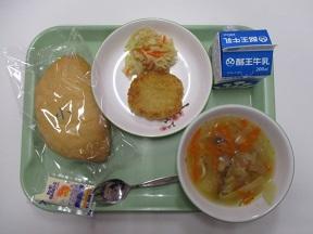 切れ目丸パン パックソース 白菜とアサリのスープ キャベツメンチカツ カラフルサラダ