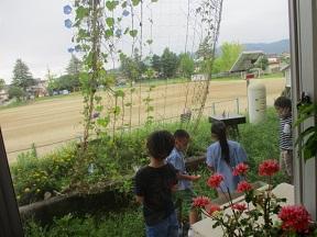 見てみると1年生が朝顔の花と種とりをしているところでした。花で色水を作るのだそうです。