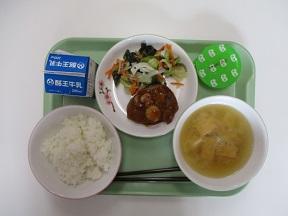 ご飯 りんごコンポート さといもの味噌汁 わかめサラダ ハンバーグきのこソースかけ