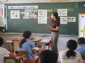 「栄養バランスのよい食事について考えよう」というめあてで、主食 主菜 副菜 汁物のバランスよい食事について、穂積先生の昼食を資料に児童たちは真剣に考えていました。