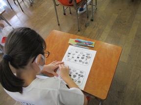 画面から流れる音声(もちろん英会話)を聞いて、その話の順番に教科書へ数字を書き込みます。児童はしっかり聞き取り、順番を正しく書くことができていました。