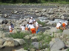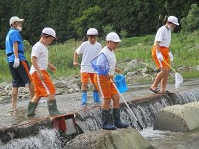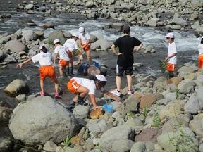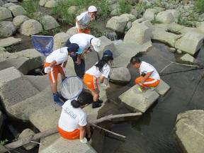 川の中に入ったり、上からのぞいたりして水生生物を探しました。