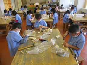 5年生は図工室で、糸鋸を使って板を切っていました。