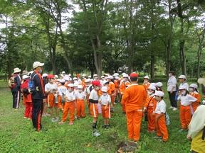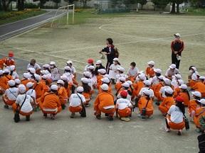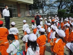 避難が完了し全体指導です。避難までに要した時間は2分13秒でした。とてもはやかったと思います。しかし少し話声が聞こえましたので、どうして「おかしも」を守らなければならないのかについて話をしました。火事や地震はいつ どこで 起こるかわかりません。自分の命は自分で守ることのできる子供になってほしいと思います。