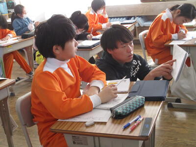 本文に線を引いたり、隣の人と話し合ったり、真剣に学習に取り組んでいました。