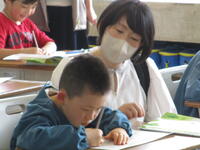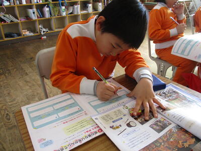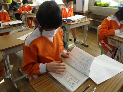 12月5日(木)、1年生が、国語の時間に書いた作文を読み合っていました。グループになって作文を読み合い、カードに感想を書きました。みんなが書いた作文には、楽しかったことがたくさん書いてありました。