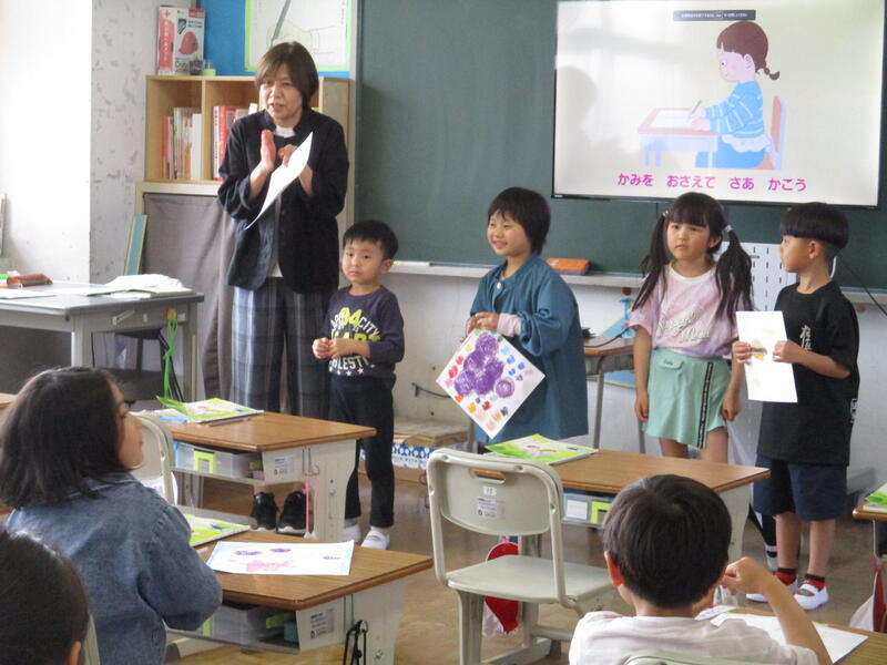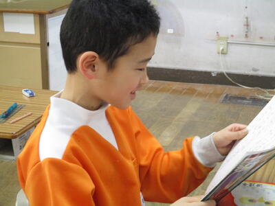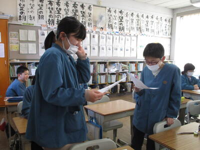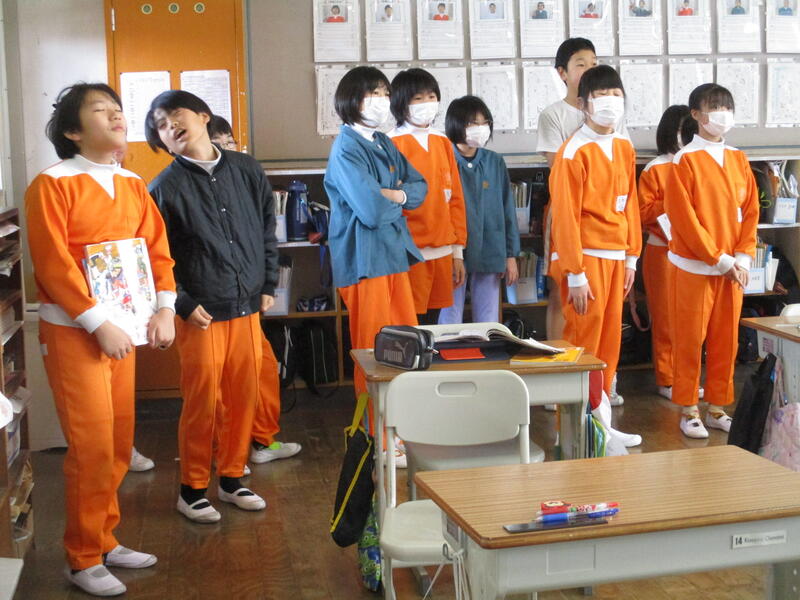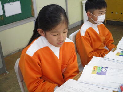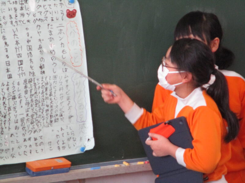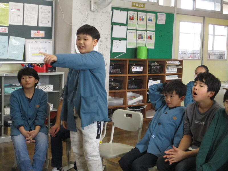 1月9日(木)、1年生が、国語の時間に「みみずの たいそう」という詩の学習をしました。グループに分かれ、みみずになったつもりで体を動かしながら朗読をしました。どのグループの発表も、土の中からとびだしたみみずのうれしい気持ちが伝わってくる元気いっぱいの朗読でした。