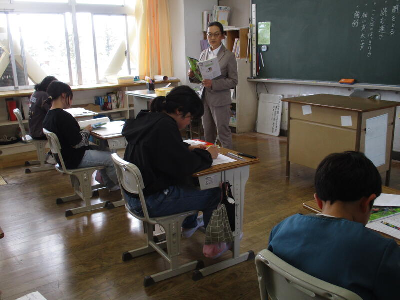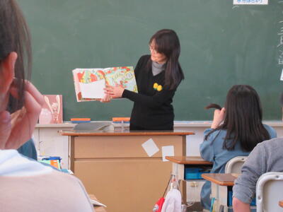 読み聞かせボランティア「たんぽぽの会」の古関さんが、今日は6年生に絵本を読み聞かせをしてくれました。