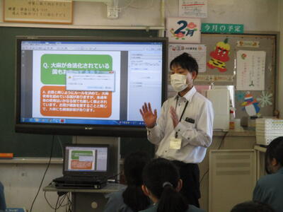 10月3日(木)3校時の理科の時間に、5年生が、クイズを考えていました。何枚かの映像を見て、何の音かを当てるクイズです。かわいらしいぬいぐるみの映像や車の映像がヒントでした。正解を言い当てた児童は大喜び。学習したことを思い出しながら答えていました。