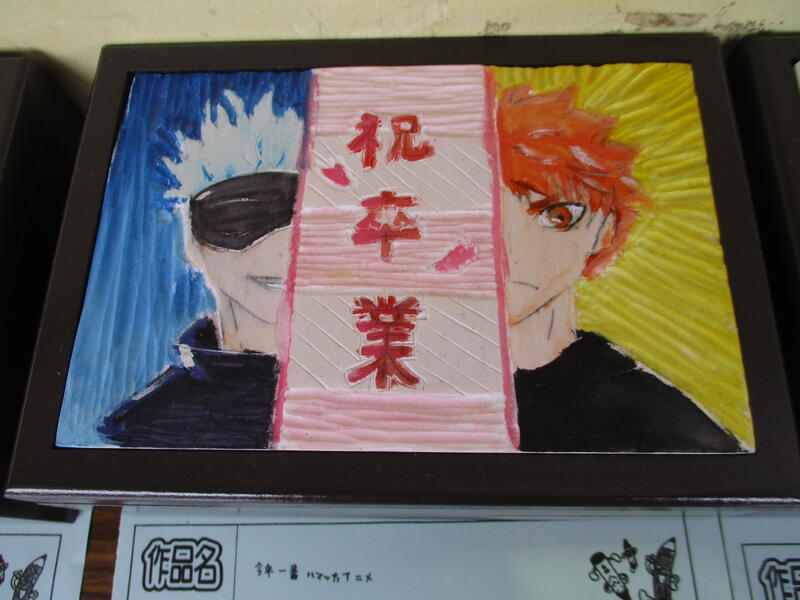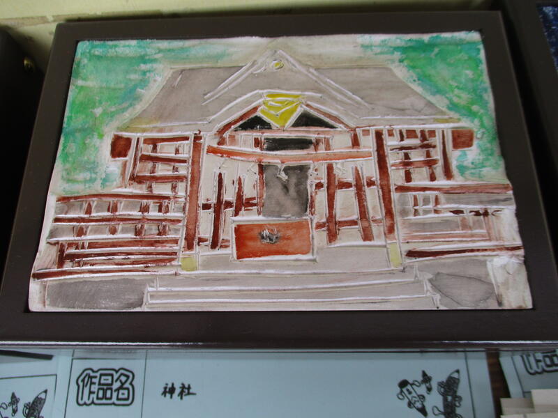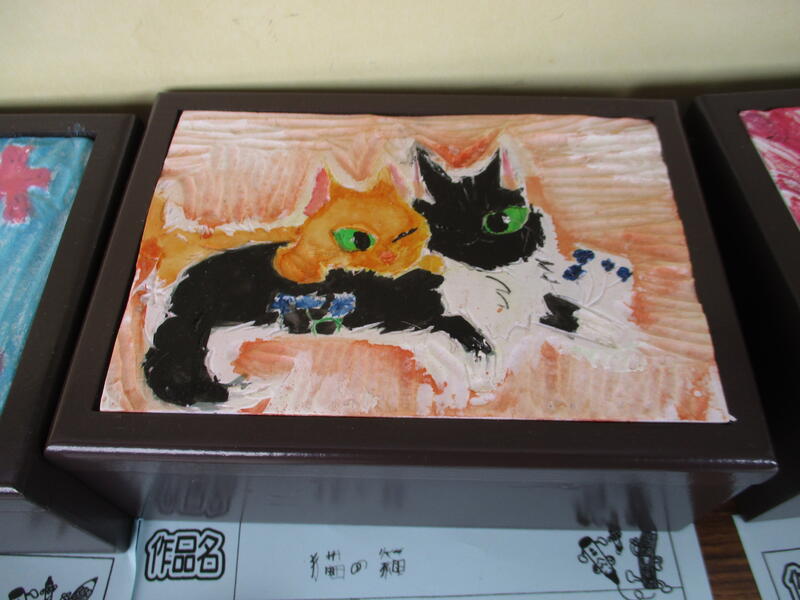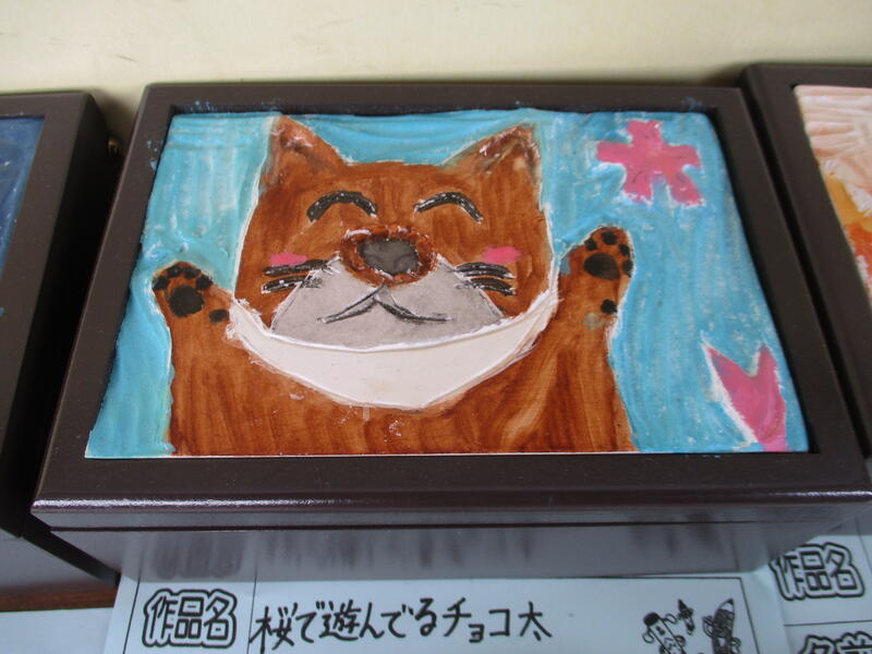 5年生が、図画工作の時間に制作した作品が飾られていました。電動のこぎりを使って形を工夫して切り、丁寧に彩色された作品です。どうぞご鑑賞ください。