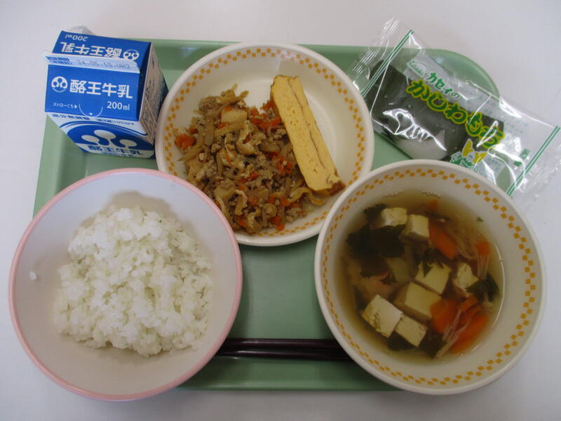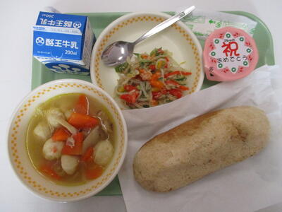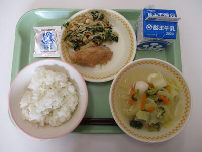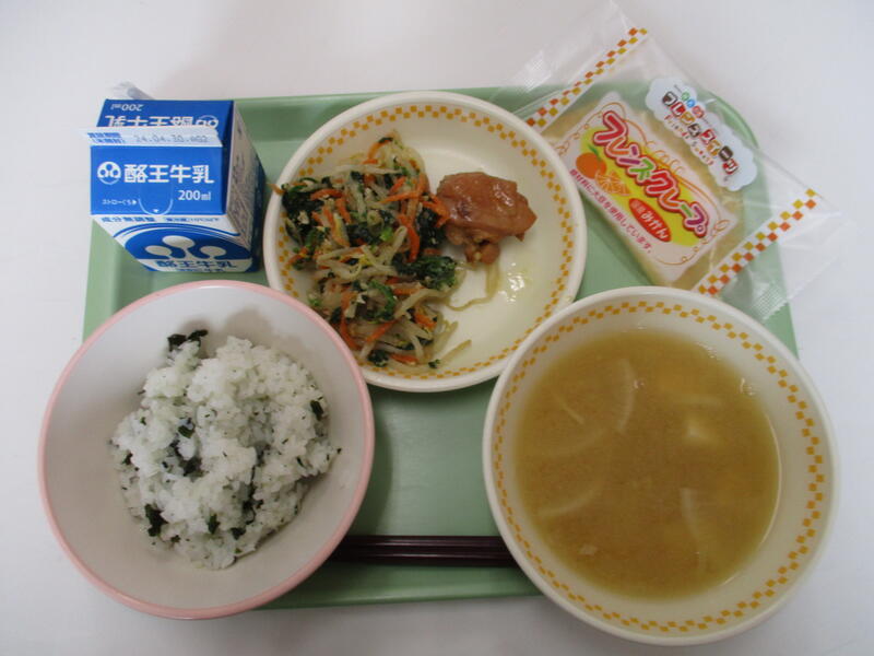 11月26日(火)の給食は、6年生が考えた献立でした。メニューは、ご飯、ますの塩焼き、豚汁、わかめサラダ、、みかんゼリー、牛乳です。家庭科で学習した五大栄養素を考え献立をたてました。全校生でおいしくいただきました。