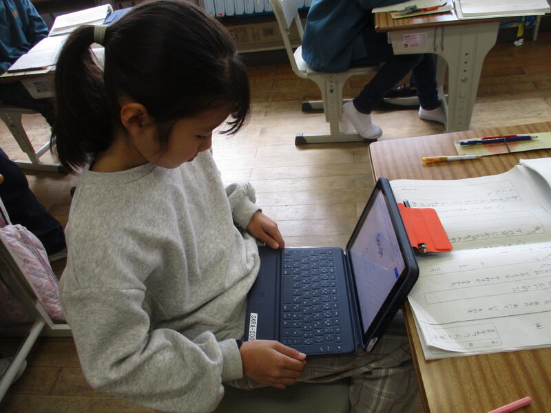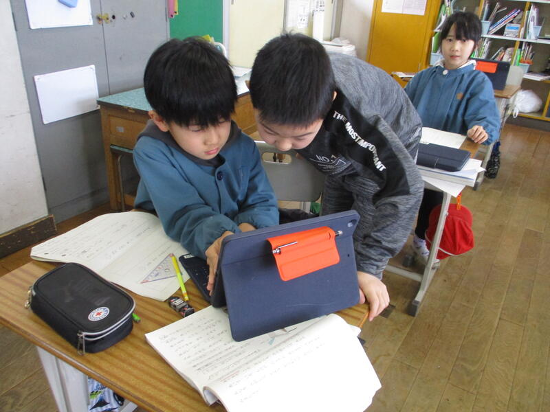 12月16日(月)、2年生が生活科の時間に、町探検でみつけたことを紹介する学習に取り組んでいました。3つのグループに分かれ、それぞれ紹介するものを話し合い、タブレットを使ってまとめていました。