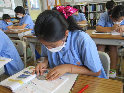 4年生が、算数の時間に、展開図の学習をしていました。展開図から図形を組み立てたり、展開図からできる図形を予想したりしていました。