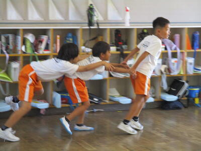 登校した子ども達が校庭に集まり、朝の時間にリレーを行っていました。今日は、3年生と6年生の混合チームのようです。2チームに分かれ、6年生がリードしながら楽しそうに走っていました。