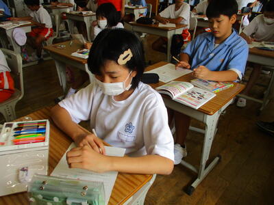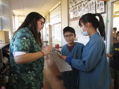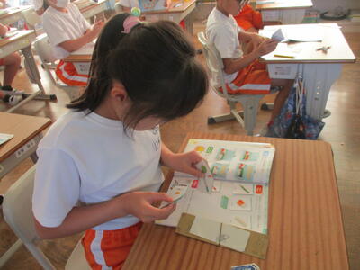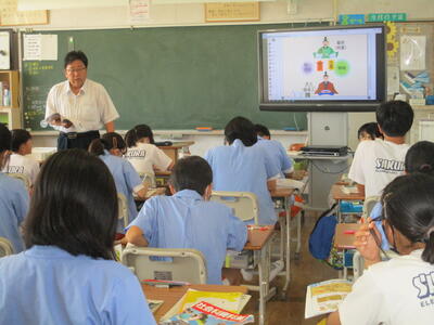 外国語活動の時間に、3年生が、ALTのステファニー先生と、How many?(数えて遊ぼう)の学習をしました。ドラゴンボールやワンピーズなどの楽しい映像を見ながら、グループで協力しながら集中して数を数えていました。