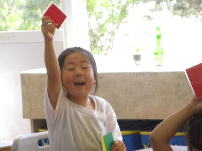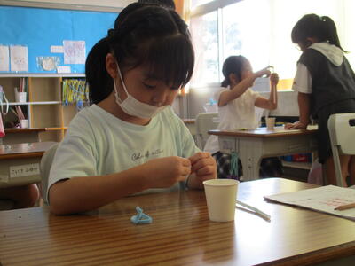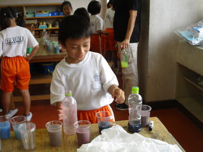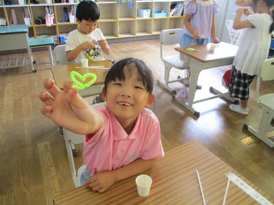 子どもたちは、透明なものが光を通して鮮やかになるのに驚いたり、友達に見せたり、楽しく活動に取り組みました。