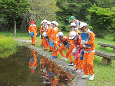 子どもたちは、めだかや貝、トンボなどを見つけて大喜びでした。