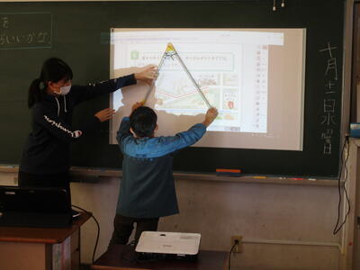3年生が、総合的な学習の時間に、町探検を行いました。学校周辺の様子について、2つの班に分かれて調べました。