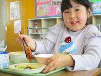 今日は、「だいすきふくしまの日」献立で、「あぶくま汁」が提供されました。「あぶくま汁」は、県北地方の郷土料理で、鮭、大根、人参、白菜などの野菜がたっぷり入ったみそ汁です。子どもたちは、温かいあぶくま汁を味わっていました。