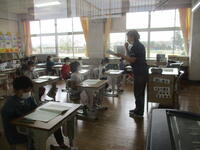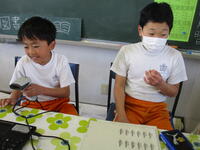 1年生が、音楽の時間に鍵盤ハーモニカを演奏していました。先生のオルガンに合わせて演奏したり、先生の演奏を聴いて同じように演奏をしたりしていました。