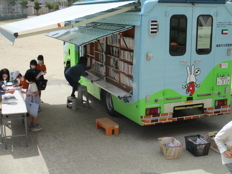 今日は、しのぶ号来校日です。2校時が終わると、子どもたちは、しのぶ号に集まってきました。自分の借りたい本を市立図書館の方に相談したり、友達と探したりしながら本を借りていました。