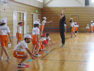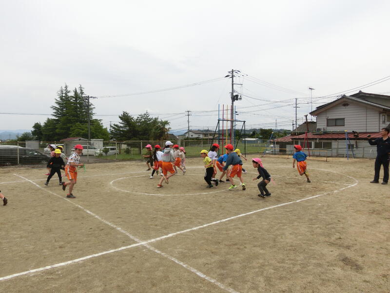 最初のゲームは、「フルーツバスケット」です。5年生は園児の皆さんに合わせて動き、園児の皆さんはだんだん慣れてきてアッという間に座っていました。