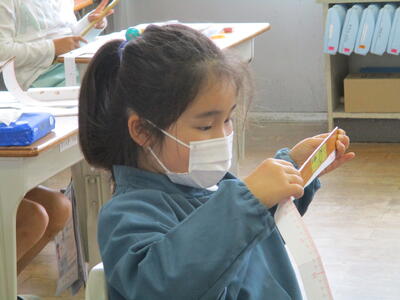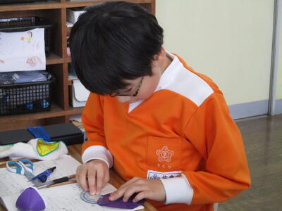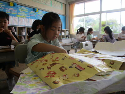 1年生は、とび出すカードを作っていました。いろいろな模様を写した紙を、形に合わせて切っていました。