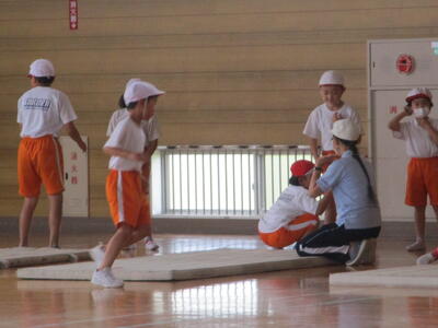 4年生が、体育の授業でとび箱の練習をしました。今日は、「首はねとび」にチャレンジです。ブリッジでマットを押すタイミングをつかみ出した子どもから、「首はねとび」に挑戦しました。簡単な補助を入れることで助け合いながら、技の習得に向けがんばっていました。