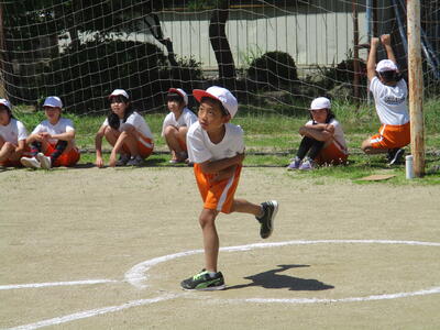 投げ上げてキャッチ→ボールパス→ボール2つでパス→ボール運び と簡単な動きからだんだん難しい動きになっていきます。名人になるために大切なことを、上手くできている友達を見てまねたり、声をかけ合ったり、意欲的に活動していました。