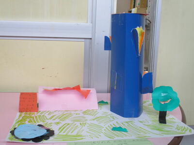 2年生が、図画工作科の時間に制作を続けてきた「ともだちハウス」が完成しました。初めは、小さなハウスでしたが、2階建てになったり、プールができたりと、どんどん大きくなってアイディアいっぱいのハウスが完成しました。