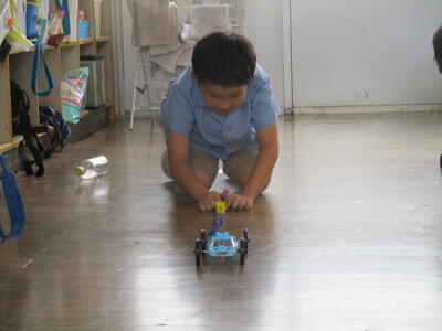 一人またはペアで電気をおこし、豆電球をつけたり防犯ブザーを鳴らしたりしました。明かりがついたり、ブザーがなったりすると歓声が上がり、さらに力一杯レバーをまわしていました。