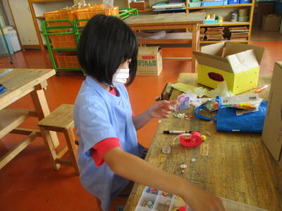 2年生が、図工の時間に「おはなしゲーム」をグループで制作していました。お話に合う形や物を見つけ、お話を思い浮かべながら工夫して作っていました。