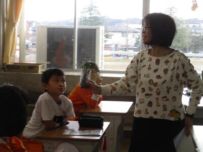 初めに、マスコットを使って干支のお話をしてくださいました。その後、龍に関する本を2冊読み聞かせしてくださいました。また、「りゅうのひげ」という植物も見せてくださいました。