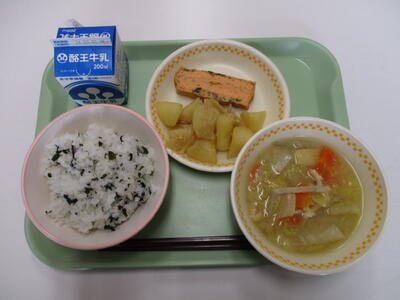 今日は、適塩の日献立でした。ご飯、なめこ汁、ますの塩焼き、いそあえ、牛乳のメニューです。素材のうまみやだしを生かした献立に工夫がされていました。2学期最後の給食、ごちそう様でした。