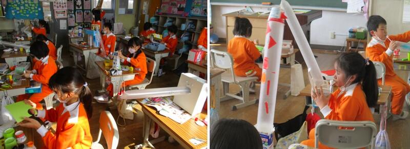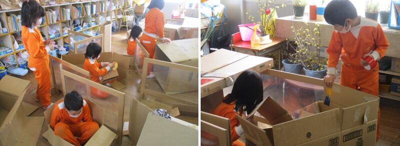 1年生が、図画工作科の時間に、テープをつないだり、編んだり、いろいろな飾りつけをしていました。