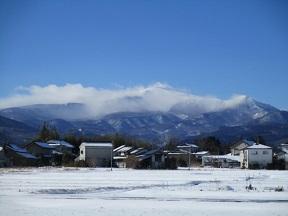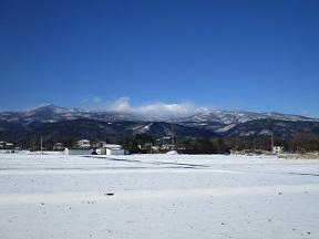 体育館の西扉から吾妻山を眺めると、晴天の空に、風で雪が飛ばされている吾妻山がきれいに見えていました。