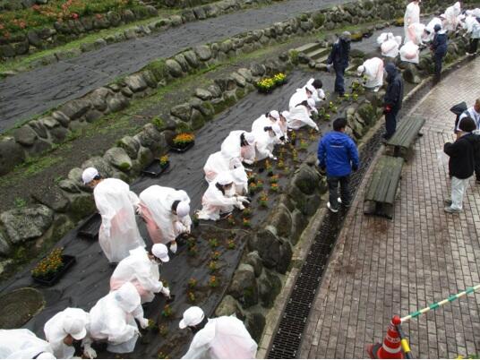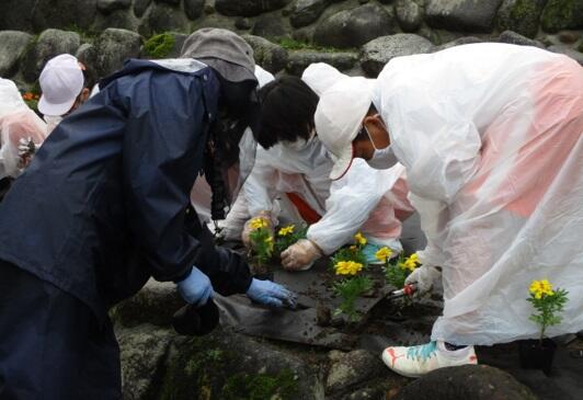 これまで学校で種から育ててきたマリーゴールドの花を、係の方の指示に従って花壇に定植しました。あいにくの雨でしたが、一つ一つ丁寧に定植しました。