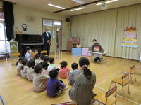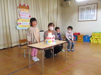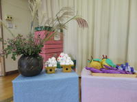年長(ちゅうりっぷ組)が幼稚園の周囲からススキをとってきて壺に飾り、年長、年少(たんぽぽ組)の子どもたちが作ったおだんご、ナシ、ブドウ、サツマイモ等をお供えし、お月見誕生会をおこないました。会では、子どもたちが司会・進行を行い、誕生児へインタビューしたり「おめでとう」を歌ったり、子どもたちの手作りのプレゼントを贈ったりしお祝いしました。