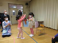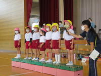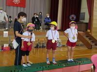 子どもたちは、夏休み以降、この日のために練習を積み重ねてきました。ピンクチームと黄色チームに分かれ競い合い、どの種目も最後まであきらめることなく、走ったり演技を行ったりして、たいへん充実し感動的な運動会でした。閉会式では、その頑張りに対して園児一人一人にメダルの授与、さらにはエルマーから、年長(ちゅうりっぷ組)に、まりつき用ボール、年少(たんぽぽ組)には、ブーブーロケットと折り紙のプレゼントがあり、子どもたちは大喜びでした。
