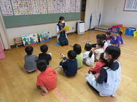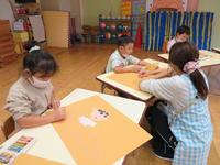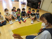 また、お月見の由来の話を聞いたり、紙芝居を見たり、「月」を歌ったりしてお月見の由来について学びました。子どもたちが楽しみにしていたおやつの団子は、弁当後に食べました。とても美味しかったそうです。