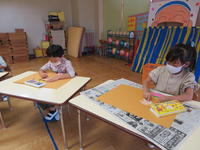 年長(ちゅうりっぷ組)は、10月3日(土)に開催した運動会の絵を描きました。子どもたちは、リレー、バルーンを使った親子ダンス、閉会式のメダル授与など、それぞれに印象に残った場面や感動した場面を思い出しながら、一生懸命に描いていました。