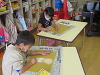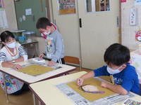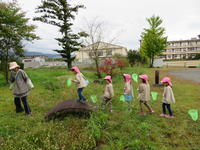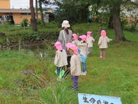 年長(ちゅうりっぷ組)は、隣接している佐倉小学校の観察池付近の草むらに虫捕りにいきました。子どもたちは、日ごろから図鑑などを見て虫に興味を抱いており、目だとくバッタやコウロギなどを捕まえていました。捕まえた虫は、飼育箱に入れ図鑑を見ながら観察したり、大切に育てているカマキリの餌にしたりし、更に生き物に興味関心を抱いている様子でした。