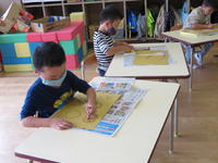 前回のエルマーからの手紙で、パワーカードをもらった子どもたち。毎日運動会の練習の後に一つずつ色染めをしていました。運動会前日、そのパワーカードを全て染めると、エルマーから再び手紙が届き「いよいよパワーがたまったね!明日はいよいよ運動会だね!冒険の準備はできているよ」と書いてあり、秘密のカギが一緒にりゅうの封筒に入っていました。「宝箱があるのかもしれない!」と探し回る子どもたちでしたが、なかなか見つからず、明日の運動会でカギを使う何かが現れるのかもしれないと考え楽しみにしていました。また、明日はエルマーやりゅうに会えるのではないいかととても楽しみにしている姿が見られました。明日はパワーを全開にして、運動会を頑張ります!