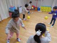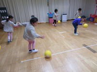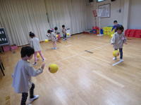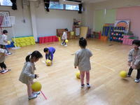 年長(ちゅうりっぷ組)は、先日の運動会でエルマーからいただいたボールを使ってのまりつきの練習を始めました。まりつきは子どもにとっては、非常に難しいですが、運動神経を発達させるためにかなり効果的な運動です。子どもたちは、音楽に合わせてできるだけ長く続けたり、足を上げたり、体を回したりする動きも取り入れながら継続して練習をしていきます。
