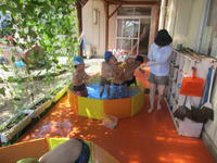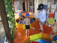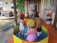 年少(たんぽぽ組)は、テラスに置いた簡易プールで水遊びをしました。子どもたちは歓声を上げながら水を掛け合ったり、水につかったりし、残り少ない夏を楽しみました。
