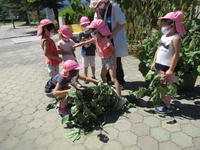 年長(ちゅうりっぷ組)は、大切に栽培しているなすの茎や葉がかなり茂り、日当たりが悪くなってきたので、秋ナスの収穫のために剪定作業を行いました。子どもたちは初めての経験で、教師の支援を受けながら恐る恐るはさみを入れていました。また、たくさんのナスを収穫できそうで楽しみです。