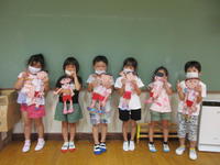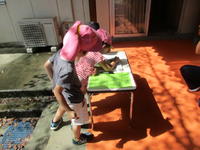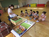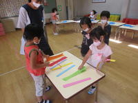 年長(ちゅうりっぷ組)は、いろいろは葉っぱをすりつぶして、お茶になるかどうかを調べました。子どもたちは、園庭にあるアサガオ、サルビア、マリーゴールド、トマト、ピーマンなどの葉を摘んで、すり鉢でそれをすってから水を入れ、お茶になるかどうか一つ一つ確かめました。終わりに遊戯室で活動を振り返り、予想どおりに緑色になって納得したり、あまり色が出なくて疑問を感じたりするなど、葉っぱの不思議さを実感しました。