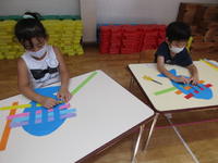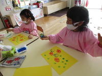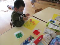 年少(たんぽぽ組)は、レンコン、オクラ、ピーマンの切り口に絵の具を塗り、色画用紙に思い思いに押して、作品を作りました。子どもたちは、押すたびに作品の感じが変わっていく様子を楽しみながら、一生懸命に押していました。