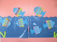 年長(ちゅうりっぷ組)は、2日間かけて壁面制作として魚をつくりました。子どもたちは、色画用紙を格子状に組み編みをしてうろこを表現するなど、思い思いに魚をつくりました。完成した魚をビニールで作った海に貼りつけました。本物の魚のように生き生きと泳いでいるように感じられました。