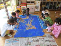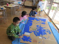 年少(たんぽぽ組)は、運動会で使用する竜のトンネルの製作を始めました。子どもたちは、大きな段ボールに、エルマーの冒険に出てくる竜をイメージしながら、みんなで協力して色をぬりました。子どもたちは一生懸命に製作し、勢い余って、床まで塗ってしまったり、作業スモックに付けてしまったりしましたが、最後まできちんと作業をすることができました。完成が楽しみです。